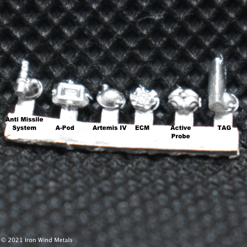 One of each type, Anti Missile System, A-Pod, Artemis IV, ECM, Active Probe, and TAG.